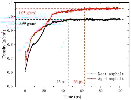 The density variation in the neat and aged asphalt binder with a 1 nm crack at 298.15 K during the crack closing process is depicted in Figure 5. The density recovery of the neat asphalt binder is completed at 46 ps, and it is extended to 63 ps for the aged asphalt binder, which marks the ending of the crack closing stage and the beginning of the intrinsic healing stage.