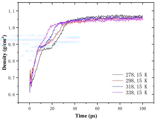 The density variation of aged asphalt binder containing a 1 nm crack at different temperatures is shown in Figure 9. The initial density is lower than the normal density of asphalt binder due to the introduction of the crack. In the first 10 ps, the system is heated to reach the target temperature, and thus the density is unstable. At the crack closing stage, raising the healing temperature results in an improved density recovery rate and a shortened duration time. At the intrinsic healing stage, the density keeps at a stable value that is affected by the healing temperature. It shows a inverse relationship with the rising temperature, which conforms to general knowledge. According to previous studies [26], strength recovery mainly happens at this stage and is highly dependent on time.