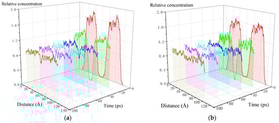 The relative concentration distribution of aged asphalt binder along the z axis is shown in Figure 8. It can be found that at the starting point of the simulation, the molecular distribution is a bimodal shape, with higher concentration at the peak and lower concentration at the edge. There are no molecules in the middle of the model, which is a vacuum space representing the crack. Under the action of density gradient, the atoms tend to move towards the crack and reach a more uniform distribution along the z axis. A healing time of 100 ps is sufficient for the closure of the 1 nm crack in the aged asphalt binder, but it needs to be prolonged for closing the 2–4 nm cracks.