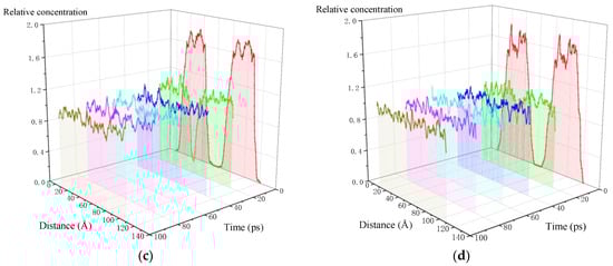 Relative concentration distribution curve along the z axis of aged asphalt binder with 1 nm crack: (a) 278.15 K; (b) 298.15 K; (c) 318.15 K; (d) 338.15 K.