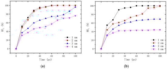 where HE1 is the self-healing efficiency of stage 1; is the density of the optimized amorphous cell of the asphalt binder at temperature T; is the initial density of the self-healing model at temperature T; and is the density of the self-healing model at simulation time t.