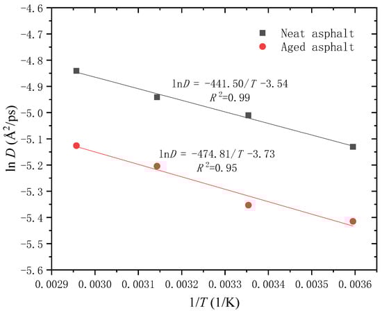 According to the data in Table 3, the variation of lnD with 1/T is obtained for the neat and aged asphalt, as plotted in Figure 14. It can be found that lnD has a good linear correlation with 1/T, which is in good agreement with Equation (5). This demonstrates that the simulation results are consistent with the theoretical analysis. Based on the fitting formula, the healing activation energy of the neat asphalt is calculated as 3.67 kJ/mol, which is a little lower than that of the aged asphalt (3.95 kJ/mol). The healing activation energy is the minimum energy needed for molecular diffusion and randomization, which can be adopted to rank the self-healing capacity of asphalt binders [28]. A lower value of healing activation energy means less energy is required for the self-healing process to initiate. Thus, it can be inferred that the neat asphalt binder has greater potential to recover mechanical strength at the intrinsic healing stage compared with the aged asphalt binder.