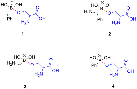 Despite these significant forward steps, to the best of our knowledge, the AMBER force field of phenyl-, benzyl-, benzylamino-, and methylamino-boronates are not available, even if these compounds are significant in numerous therapeutic fields. In fact, phenyl- and methyl-amino boronates are β-lactamases inhibitors [20] and anti-HIV agents [21]. Phenyl-boronates are also amazing prodrugs, like ZB483, able to produce a 40-fold increase in the endoxifen concentration peak in plasma when used in breast cancer therapy [22]. Based on their importance in medicinal chemistry, our attention has been focused on compounds 1–4, reported in Figure 1, to potentially open the way to the search of new drugs with the fundamental support of molecular modeling.