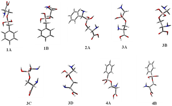 DFT Calculations. All the calculations were carried out by using the GAUSSIAN16 program package [33]. The conformational space of compounds 1–4 was explored through the optimization of all the possible starting geometries using the DFT approach at the B3LYP level with the 6-31G(d) basis set [38,39]. To take into account the influence of the solvent, optimizations were conducted in water, using the polarizable continuum model (PCM) [40]. All the degrees of conformational freedom were considered. The conformational preferences of the single bonds of the molecules were determined through the evaluation of the three different gauche, mgauche and anti orientations, combining them and locating different geometries. The percentage contribution of each optimized conformation to the overall population was determined at 298 K through the Boltzmann equation. Vibrational frequencies were computed at the same level of theory to verify that the optimized structures were minima.