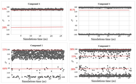 Dihedral torsion angle values τ1, τ2, τ3, and τ4 of compound 1 over the MD simulations. The red dotted line highlights the torsional angles values, found by DFT calculations, in the most populated energy minima. The red label on the left displays the corresponding population percentage.