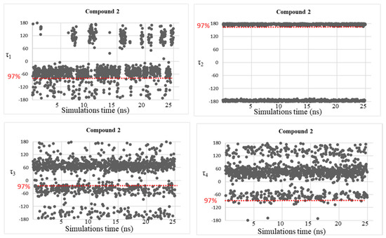 Dihedral torsion angle values τ1, τ2, τ3, and τ4 of compound 2 over the MD simulations. The red dotted line highlights the torsional angles values found by DFT calculations in the most populated energy minima. The red label on the left displays the corresponding population percentage.