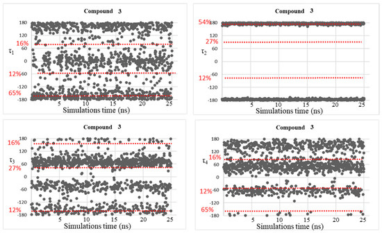 Dihedral torsion angle values τ1, τ2, τ3, and τ4 of compound 3 over the MD simulations. The red dotted line highlights the torsional angles values found by DFT calculations in the most populated energy minima. The red label on the left displays the corresponding population percentage.