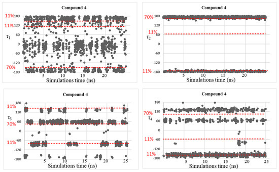 Dihedral torsion angle values τ1, τ2, τ3, and τ4 of compound 4 over the MD simulations. The red dotted line highlights the torsional angles values found by DFT calculations in the most populated energy minima. The red label on the left displays the corresponding population percentage.