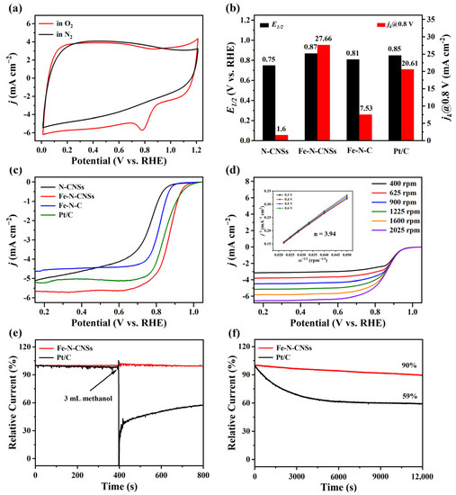 (a) CV curves of Fe-N-CNSs in O2/N2 saturated electrolyte. (b) LSV curves of the synthesized materials and Pt/C. (c) E1/2 together with jk@0.8 V towards these materials. (d) LSV curves of Fe-N-CNSs at different rotational speeds and the K-L plots. (e) Methanol tolerance and (f) i-t curves of Fe-N-CNSs and Pt/C.
