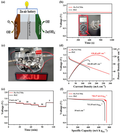 (a) Schematic diagram of ZAB. (b) OCV of two ZABs. (c) The photograph of the LED panel powered by the Fe-N-CNSs-based ZAB. (d) Discharging LSV and power density curves, (e) discharge curves of two materials from 5 to 50 mA cm−2, and (f) the specific capacity of two ZABs.