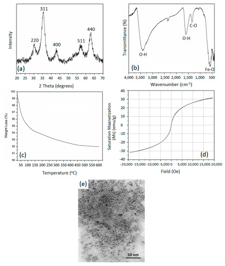 - Nkurikiyimfura, I.; Wang, Y.; Safari, B.; Nshingabigwi, E. Temperature-dependent magnetic properties of magnetite nanoparticles synthesized via coprecipitation method. J. Alloys Compd. 2020, 846, 156344. [Google Scholar] [CrossRef]