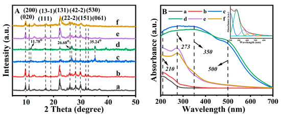 XRD patterns (A) and diffuse reflectance UV-vis spectra (B) of CP (a), NH4−CP (b), Fe(0.03) −H(0.00) −CP−9 (c), Fe(0.06) −H(0.00) −CP−9 (d), Fe(0.03) −H(0.05) −CP−9 (e), and Fe(0.06)−H(0.07)−CP−9 (f).