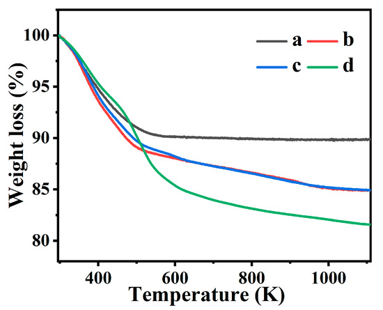 Figure 3 present the TG profiles of CP and various Fe-containing CPs. As can be seen in Figure 3a, the weight loss process of CP could be divided into approximately three stages. In the temperature range from 373 to 473 K, the rapid mass loss (~4.5%) was documented by the steep slope of the TG curve, as it should be attributed to the loss of the water located in the CP cavities and bound to the non-framework cations [38]. Subsequently, the weight loss with a slight slope was less (~1.7%) during the temperature range from 473 to 673 K, corresponding to the desorption of chemisorbed water. Finally, its lighter slope in the temperature range from 673 to 1073 K was attributed to dehydroxylation [38].