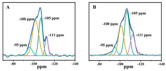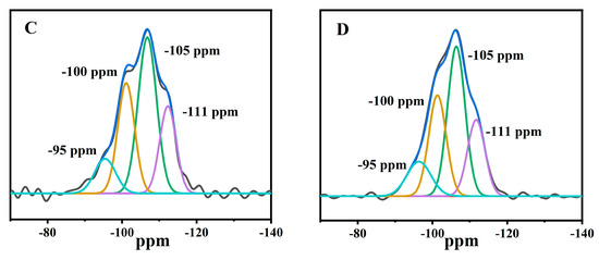 Additionally, four lines were deconvoluted after the acid treatment at pH = 1.3 (Figure 4B,C). The relative strength and linewidth of the −100 ppm line decreased significantly, as compared with that of CP (Figure 4A). This signal was associated with those Si bonded to 1 or 2Al, implying the extraction of Al from the frameworks. In the case of Fe(0.03)−H(0.05)−CP−3 and Fe(0.03)−H(0.05)−CP−9 (Figure 4B,C), the increase of the −105 and −111 ppm lines was at the expense of the −100 ppm. In general, the resulting dealumination mainly varied the environment around the Si(2Al) line, leading to generation of Si(1Al), possibly Si(0Al), losing of 1 or 2 Al species. Similarly, Fe(0.03) −HCl(0.00) −CP−9 (Figure 4D) modified in the FeCl3 solution presented the same phenomenon.