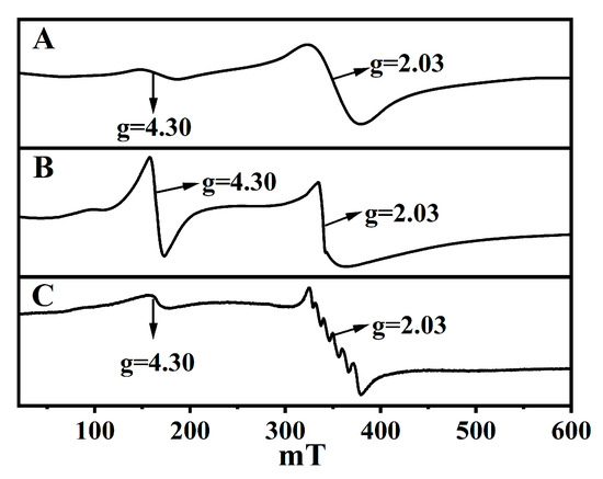 EPR spectroscopy is an important tool for identifying the oxidation states of the transition elements in the aluminosilicate materials [37]. The above 29Si-NMR patterns establish the Fe species coordination in CPs. Figure 5 shows the EPR spectra acquired at 77 K for Fe-substituted CPs. As can be seen, all samples presented two signals: a sharp signal at g = 4.3 assignable to tetrahedral Fe3+ [28], and a broad signal at g = 2.0 assignable to octahedrally coordinated Fe3+ in the non-framework positions. Their deformation was the same as profiles reported by Bordiga et al. [45]. In detail, the signal intensity of Fe(0.03)−H(0.05)−CP−9 (Figure 5A) at g = 4.3 was greater than that of Fe(0.03)−H(0.05)−CP−3 (Figure 5B) and Fe(0.03) −HCl(0.00) −CP−9 (Figure 5C), suggesting that the increased modified times or the acid treatment were conducive to more coordinated tetrahedral Fe3+ entering the CP skeletons. On the contrary, the superimposed signals (g = 2.0) detected in Fe(0.03)−H(0.00)−CP−9 (Figure 5C) should be mainly attributed to β-FeOOH clusters when the hydrothermal modification of the CP was conducted using an FeCl3 solution without acid treatment, while a small portion of Fe species (g = 4.3) still had tetrahedral coordination to CPs framework.