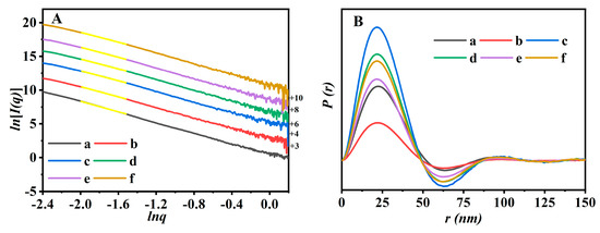 The fractal structural evolutions of Fe-modified CPs with different modification times were elucidated by SAXS patterns. As shown in Figure 6A, the linearity of the ln[I(q)] versus ln(q) scattering profile drew the fractal property of the particles [49]. The straight lines in the q regions were determined to be in the range of 0.14 < q < 0.21 nm−1, which were fitted using the linear least-squares method. The corresponding slope continuously varied from −3.09 to −3.85. These results implied that all the CPs possessed surface fractal features [50]. In detail, the surface fractal dimension (Ds) value gradually increased with the increasing of the modified times and Fe3+ content, from 2.044 for parent CP (Figure 6Aa), to 2.239 for Fe(0.03)−H(0.05)−CP−1 (Figure 6Ab), and 2.351 for Fe(0.03)−H(0.05)−CP−3 (Figure 6Ac), indicating that the surfaces of the Fe-containing CPs became disordered and rough [51]. Then, the Ds values were no longer obviously changing with the increasing continuous content of Fe3+ (Figure 6Ad–f), indicating that the degree of disorder of CPs may have reached an upper limit.