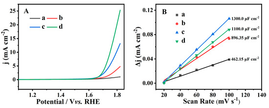 LSV curves (A) and plots of current density difference (Δj) against the scan rate (B) of CP (a), Fe(0.03)−H(0.05)−CP−3 (b), Fe(0.03)−H(0.05)−CP−9 (c), and Fe(0.03)−H(0.00)−CP−9 (d).