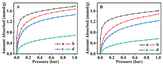 Equilibrium adsorbed isotherms of CO2 at 273 K (A) and 298 K (B) for CP (a), Fe(0.03)−H(0.05)−CP−3 (b), Fe(0.03)−H(0.05)−CP−9 (c), and Fe(0.03)−H(0.00)−CP−9 (d).