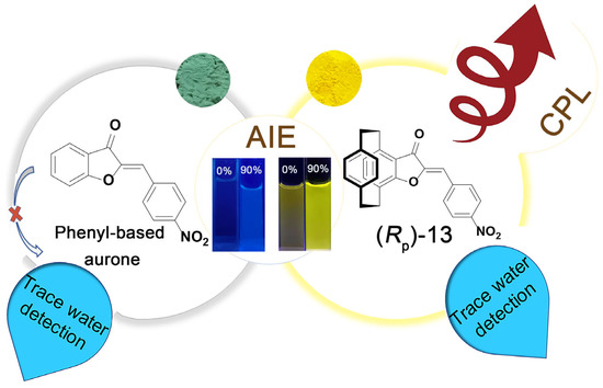 - Duan, W.Z.; Liu, W.J.; Liu, H.T.; Ji, H.H.; Huo, Y.M.; Wang, H.W.; Gong, S.W. AIE-active aurones for circularly polarized luminescence and trace water detection. Chem. Commun. 2022, 58, 13955–13958. [Google Scholar] [CrossRef]