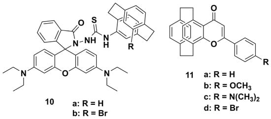 Of the various Hg2+ fluorescent probes, rhodamine-based chemodosimeters for Hg2+ have become increasingly attractive because of the rapidity, high sensitivity, and excellent selectivity of their mercury-promoted desulfurization reactions. However, to our best knowledge, the spectroscopic properties of the PCP skeleton in rhodamine-based fluorescent probes have yet not been reported. In 2017, our group reported two novel fluorescent probes 10a,b (Scheme 3) [36], which were the first PCP skeleton fluorescent probes based on rhodamine dye. Firstly, we studied the sensing behaviors of 10a,b in different environments; the probe 10a exhibited highly selective and sensitive responses to Hg2+ in aqueous solution. The sensing behaviors toward Hg2+ were studied by UV–vis and fluorescence spectroscopy in an HEPES buffer (HEPES/EtOH = 1:1 v/v, pH 7.2). We found that the gradual addition of Hg2+ (from 5 to 90 μM) to the solution of compound 10a resulted in enhanced absorption and fluorescence intensities with a color change from colorless to pink. The results indicate that the probe 10a can serve as a “naked eye” probe for Hg2+. We also investigated the pH effect and the long-term response time on the fluorescence intensity with the addition of Hg2+. The fluorescent response was stable over a wide pH range of 6−10, and the time-dependent change in absorbance and fluorescence intensity terminated within 15 min. Meanwhile, we also investigated the addition of other ions, such as Al3+, Fe3+, Ni2+, Co2+, Cd2+, Ca2+, Mn2+, Pb2+, Mg2+, K+, Na+, and Ag+, which showed little interference with the fluorescence response resulting from the addition of Hg2+. The sensing mechanism was also proposed as being based on the stoichiometric and irreversible Hg2+-promoted reaction of the spirolactam 10a to a ring-opened amide. These results demonstrate that compound 10a can be used as a selective and rapid fluorescent probe for Hg2+ over various other metal ions. Furthermore, these spectroscopic properties of the through-space delocalized PCP core are analogous to the alkyl and can help researchers to gain insight into the spectroscopic properties of PCP in fluorescent probes. In addition, we evaluated the cell viability of 10a by MTT assay. When the concentration of 10a increased from 2.5 to 10 μM, the percentage viability of the studied A549 cells displayed no significant reduction, which indicates that the fluorescent probe 10a has good biocompatibility in A549 cells. Finally, we also evaluated the capacity of fluorescent probe 10a to operate within living cells. The 10a-stained human A549 lung adenocarcinoma cells were tested before and after the addition of Hg2+ by confocal microscopy. By comparing with the MitoTracker Green FM-stained A549 cell, the probe 10a showed cell membrane permeable capability and can be applied in detecting intracellular Hg2+ in human lung adenocarcinoma cells. Therefore, the introduction of the PCP skeleton to rhodamine-based chemodosimeters can improve the selectivity, sensitivity, and biocompatibility of rhodamine dyes.