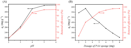 2.2. Effect of pH and PAA Sponge Dosage on Adsorption Performance