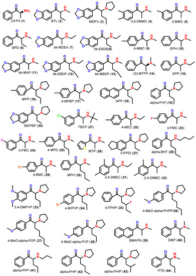 Chemical structures of 44 emergent SC selected for in silico studies, namely: CATH: cathinone or norephedrone (1); BTL: butylone (2); MDPV: 3,4-methylenedioxypyrovalerone (3); 3,4-DMMC: 3,4-dimethylmethcathinone (4); 3-MMC: 3-methylmethcathinone (5); BPD: buphedrone (6); bk-MDEA: ethylone (7); bk-EBDB: eutylone (8); 4-MMC: mephedrone or 4-methylmethcathinone (9); EPH: methcathinone or ephedrone (10); bk-MAP: methylone (11); bk-EBDP: N-ethylpentylone (12); bk-MBDP: pentylone (13); (S)-MTFP: (S)-metamfepramone or N,N-dimethylcathinone (14); EPP: ethcathinone (15); MPP: pyrovalerone (16); 4-MPBP: 4-methyl-α-pyrrolizinobutyrophenone (17); NPP: naphthylpyrovalerone or naphyrone (18); α-PVP: α-pyrrolidinovalerophenone (19); MDPBP: 3,4-methylenedioxy-α-pyrrolidinobutyrophenone (20); TBCP: bupropion or amfebutamone (21); 4-MEC: 4-methylethcathinone (22); 4-FMC: 4-fluoromethcathinone or flephedrone (23); 3-FMC: 3-fluoromethcathinone or 3-flephedrone (24); 4-MPD: 4-methylpentedrone (25); MTP: thiothinone (26); 5-PPDI: indanyl-α-pyrrolidinobutiophenone (27); α-BHP: α-butylaminohexanophenone (28); 4-BMC: 4-bromomethcathinone or brephedrone (29); MPH: hexedrone (30); 2,4-DMEC: 2,4-dimethylethcathinone (31); 2,4-DMMC: 2,4-dimethylmethcathinone or 2-methylmephedrone (32); 3,4-DMPVP: 3,4-dimethoxy-α-pyrrolidinopentiophenone (33); 4-BrPVP: 4-bromo-α-pyrrolidinopentiophenone (34); 4-FPHP: 4-fluoro-α-pyrrolidinohexanophenone (35); 4-MeO-α-PHPP: 4-methoxy-α-pyrrolidinoheptanophenone (36); 4-MeO-α-POP: 4-methoxy-α-pyrrolidinooctanophenone (37); 4-MeO-α-PVP: 4-methoxy-α-pyrrolidinovalerophenone (38); BMAPN: 2-(methylamino)-1-(naphthalen-2-yl)propan-1-one (39); DMP: dimethylpentedrone (40); α-PPP: α-propyloaminopentiophenone or N-propylpentedrone (41); α-PHP: α-pyrrolidinohexanophenone (42); α-PIHP: α-pyrrolidinoisohexanophenone (43); PTD: pentedrone (44).