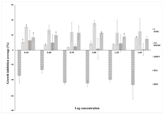 Percentage of growth inhibition vs log concentration in Tetrahymena thermophila after 28 h of exposure to the five SC (BPD, 3-MMC, 3,4-DMMC, MDPV and BTL) at the six concentrations tested. The results are expressed as the mean ± standard deviation (SD) obtained from three independent experiments. (Asterisks (*) represent significant differences compared to the control).