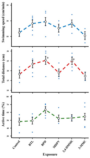 No significant differences were observed in swimming speed and active time for all SC. However, total distance traveled was significantly increased in the organisms exposed to BPD and 3,4-DMMC (Figure 4, Table 4).