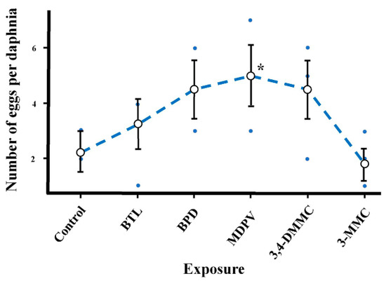 Reproductive effects (number of eggs per daphnia) on Daphnia magna at day 8 of exposure to BTL, 3,4-DMMC, 3-MMC, MDPV, and BPD. (Asterisks (*) represent significant differences compared to the control).