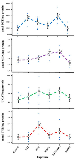 A significant increase in reactive oxygen species (ROS) levels was verified for BTL and 3,4-DMMC exposures, but no changes were found for other 3-MMC, MDPV, and BPD (Figure 6, Table 6). A significant increase in thiobarbituric-acid-reactive substances (TBARS) levels was observed for MDPV and 3,4-DMMC (Figure 6, Table 6). No changes in catalase (CAT) and acetylcholinesterase (AChE) enzymatic activity were observed except for BPD, which caused a significant stimulation of AChE activity.