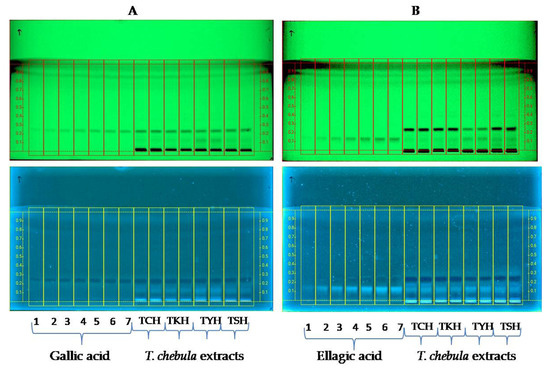 HPTLC chromatogram of increasing concentrations of gallic acid (A) and ellagic (B) and hydroalcoholic extracts of T. chebula fruits (TCH, TKH, TYH, and TSH) at 254 nm and 366 nm.