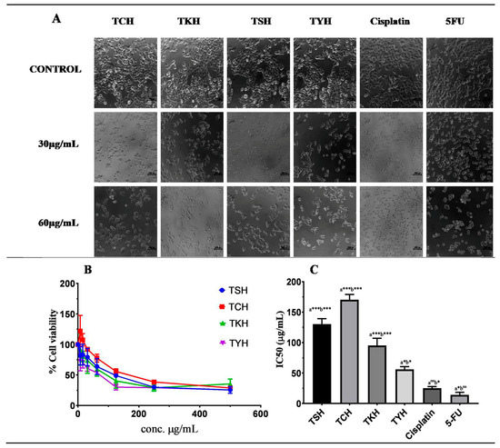 (A) Morphology of cells as observed, under inverted light microscope, after treatment with varying concentrations (0, 30, and 60 µg/mL) of T. chebula extracts for 48 h. (B) Cytotoxic effect of T. chebula extracts on HCT116 cells was determined using MTT assay. Cells were seeded in 96-well plates and treated with varying concentrations (0–500 µg/mL) of extracts. MTT assay was performed after 48 h. (C) Graphical representation of IC50 values of T. chebula extracts and standard drugs cisplatin and 5-FU. One-way ANOVA; p < 0.05; n = 3 (*** p < 0.001; * p < 0.05) (“a”, comparison with cisplatin; “b”, comparison with 5-FU).
