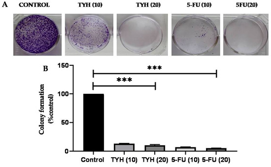(A) Cells’ capacity to form colonies after being exposed to various doses of TYH for 24 h. Crystal violet dye was used to stain cells after they had been fixed with 4% paraformaldehyde, and a colony counter was used to count the number of colonies. (B) Graph showing % colonies formed after treatment with different concentrations (0, 10, and 20 µg/mL) of TYH for 24 h. The values indicate mean ± SD (n = 3), *** p < 0.001 vs. control. Graph shows dose-dependent decrease in % colony formation relative to control.
