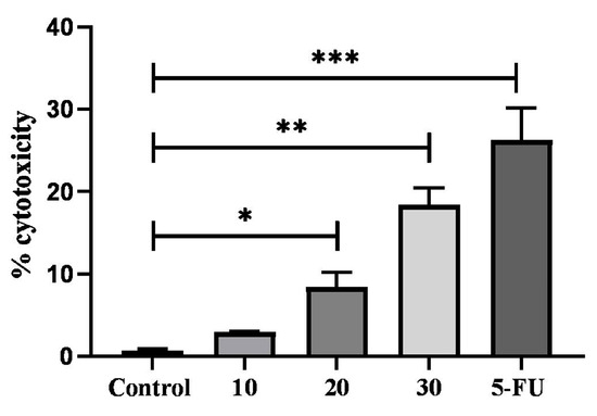 HCT-116 cells were treated with increasing concentrations (10, 20, and 30 µg/mL) of TYH. 5-FU (10 µg/mL) was used as positive control. Incubation was carried out for 48 h. Release of LDH was detected using CyQUANT™LDH Cytotoxicity Assay Kit. Data are represented as mean ± SD (n = 3), (*** p < 0.001; ** p < 0.01; * p < 0.05) vs. control.