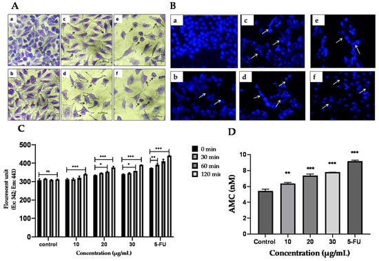 Morphological detection of apoptosis through Giemsa (A) and DAPI (B) staining. HCT 116 cells were treated with TYH and 5-FU for 48 h, (a) Control (non-treated), (b) 30 µg/mL, (c) 60 µg/mL, (d) 90 µg/mL, (e) 120 µg/mL, and (f) 5-FU (10 µg/mL) and changes in cell morphology were examined. Further effect of TYH on caspase-3 enzyme activity in HCT 116 cells after 48 h of treatment was checked using EnzChek® Caspase-3 Assay Kit. (C). Time-dependent increase in caspase-3 enzyme activity after treatment with TYH for 48 h. (D) Quantification of AMC release in cells treated with TYH after an incubation time of 120 m. Results represent mean ± SD (n = 3), where *** p < 0.001; ** p < 0.01; * p < 0.05 vs. control.