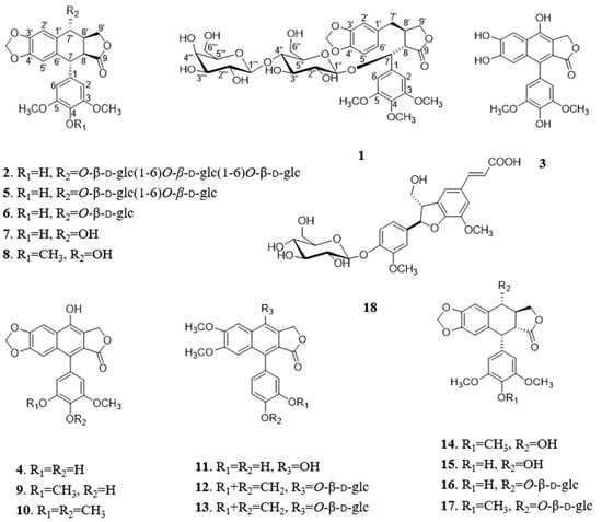 Arylnaphthalide lignans have received much attention due to their potent antiviral, antineoplastic, anti-inflammatory, and immunosuppressive properties [1]. The representative effective component (such as podophyllotoxin) has been the subject of extensive research on new antiviral and antineoplastic drugs. Podophyllotoxin tincture is used clinically to treat condyloma acuminatum. Podophyllotoxin derivatives, for instance etoposide and teniposide, are the frontline chemotherapeutic drugs against various cancers. Since remote times, plants containing podophyllotoxin and its analogues have been used by diverse nationalities as laxatives and for the treatment of gonorrhea, tuberculosis, menstrual disorders, psoriasis, dropsy, cough, syphilis and venereal warts [2,3]. So a medicinal plant rich in arylnaphthalide lignans is an important source of natural anticancer agents.