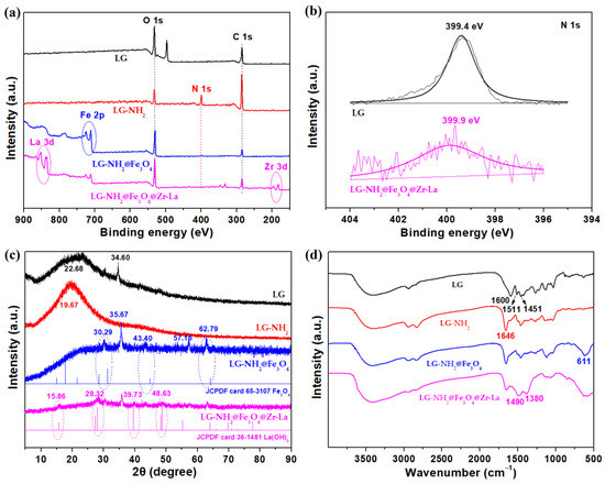 The elemental composition and chemical bonds of LG-NH2@Fe3O4@Zr-La were determined by XPS analysis [26]. As shown in Figure 2a, the XPS survey of LG exhibited obvious signals of carbon and oxygen elements. After PEI functionalization, a new N 1s peak was observed in the spectrum of LG-NH2, indicating the successful grafting of PEI onto the LG. In addition, a Fe 2p peak appeared in the spectrum of LG-NH2@Fe3O4, implying the successful loading of Fe3O4 onto aminated lignin. The peaks of La 3d and Zr 3d were clearly observed in the spectrum of LG-NH2@Fe3O4@Zr-La. As shown in Figure 2b, the binding energy of N 1s shifted slightly from 399.4 eV to 399.9 eV, probably resulting from the coordination with Zr and La. Thus, the above results indicated that the lignin was successfully functionalized by PEI, Fe3O4 and Zr-La dual-metal hydroxide.