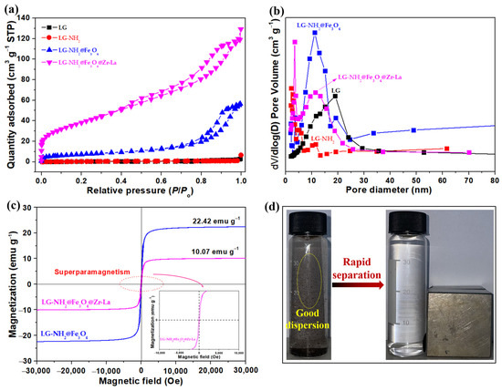 Figure 3c shows the magnetic hysteresis loops of LG-NH2@Fe3O4 and LG-NH2@Fe3O4@Zr-La. The saturation magnetizations of LG-NH2@Fe3O4 and LG-NH2@Fe3O4@Zr-La were 22.42 emu g−1 and 10.07 emu g−1, respectively. In addition, the coercivity and reminisce values of LG-NH2@Fe3O4@Zr-La were observed to be almost zero, indicating its superparamagnetic state [31]. It was observed that LG-NH2@Fe3O4@Zr-La particles exhibited a low saturation magnetization. The reason for the reduction in magnetization is on the one hand due to its low Fe3O4 content, but on the other hand, it may be attributed to the surface order/disorder interaction of the magnetic spin moment and the presence of a shell layer [34]. It could still be rapidly recovered from water under an external magnetic field within 30 s (Figure 3d). Therefore, LG-NH2@Fe3O4@Zr-La with a sensitive magnetic response could be easily separated from aqueous solution after the adsorption.