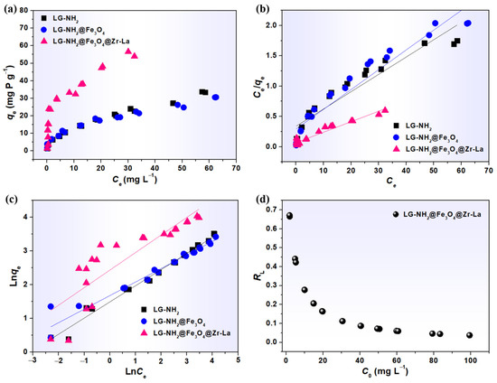 The phosphate adsorption isotherms were examined at 25 °C to evaluate the performance of lignin-based adsorbents. As shown in Figure 4a, the pristine LG could be dissolved in an aqueous solution, which made it impossible to measure the phosphate adsorption capacity [14]. The LG-NH2 showed a certain adsorption capacity toward phosphate, mainly due to the interaction between positively charged quaternary ammonium groups and phosphate ions. After the loading of Fe3O4, the adsorption capacity of LG-NH2@Fe3O4 decreased a little, probably because the coordination between amino groups and irons reduced the amount of free amino groups. The impregnated Zr and La species exhibited preferable adsorption toward phosphate through ligand exchange or metal-ligand interactions [23].