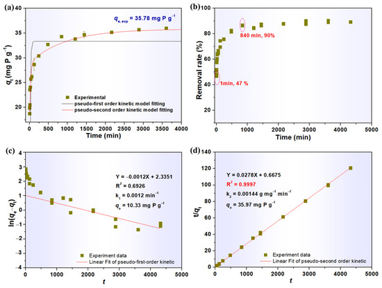 (a) Kinetic process and non-linear forms of pseudo-first-order and pseudo-second-order; (b) effect of contact time on phosphate removal rate; the linear plots results of pseudo-first-order model (c) and pseudo-first-order model (d).