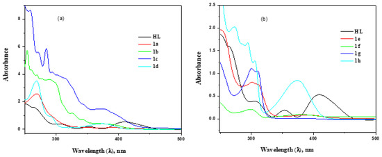 The electronic spectra of metal(II) complex 1(a–h) were measured using methanol solution (Figure 1a–c) and are presented in Table 2. A series of intense bands were observed for the ligand (HL) at 264, 353, and 409 nm, which were assigned to π–π* and n–π* transitions involved in azomethine nitrogen and aromatic ring systems, and this transition showed a decrease in wavelength at 230–300 nm upon complexation [29]. A moderately intense band at around 330–390 nm corresponds to the ligand-to-metal charge transfer transition [30]. In the visible region, cobalt(II) complexes 1a and 1e showed two weak absorption bands at 494 and 634 nm as well as 463 and 619 nm, respectively, suggesting a distorted trigonal bipyramidal geometry around the metal ion [31]. Whereas the nickel(II) complexes 1b and 1f and copper(II) complexes 1c and 1g showed one weak broad absorption peak in the 620–650 nm region due to the distorted square pyramidal geometry around the metal(II)complexes [32]. Moreover, the zinc(II) complexes 1d and 1h did not present any bands in the visible region due to their diamagnetic behavior and the d10 electronic configuration of the metal ion [33].