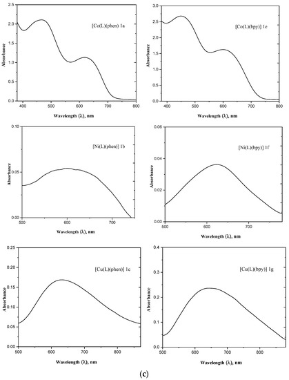 As shown in Table 2, the FT-IR spectra of the mixed ligand complexes 1(a–h) were measured in the 450–4000 cm−1 wavelength range (Figure S1 from Supplementary Materials). A broad peak was observed in the ligand 3300–3500 cm−1 region due to the -OH stretching vibration of the ligand (HL), which was not present in the complexes for which the coordination mode of the deprotonated hydroxyl group with metal ions was confirmed. The C=N- (azomethine) stretching frequency of the ligand showed a strong absorbance peak at 1643 cm−1; a shift toward the higher wavelength region (1610–1635 cm−1) of the metal(II) complexes revealed that the azomethine nitrogen had coordinated with metal ions (Table 2) [21]. The bands at (1570–1590 cm−1) and (1350–1380 cm−1) were attributed to the asymmetric and symmetric vibrational frequencies, respectively, of the carboxyl groups present in the amino acid [22,23,24,25]. The absence of a band in the 1700–1750 cm−1 region suggested that the COO− group of L-valine was coordinated with the central metal ion and that the difference in the frequency value between the asymmetric and symmetric stretching vibrations of the complexes lay between 180 and 216 cm−1, for which the latter is practically larger than that of a free carboxylate ion [26]. These findings supported the notion of a monodentate coordination of the carboxyl group of L-valine with metal ions. The spectra of all the complexes showed a strong band at 725–727 cm−1, thus indicating that –CH was out of the plane in the center ring of 1,10-phenanthroline. The lower frequency regions of the metal(II) complexes around 540–565 cm−1 and 450–505 cm−1, which are attributed to the (M-O) and (M-N) bands, respectively, confirmed the coordination of ligands with metal ions [27,28]. Hence, all the above facts are in good agreement with the complexes coordinated as a tridentate mode.