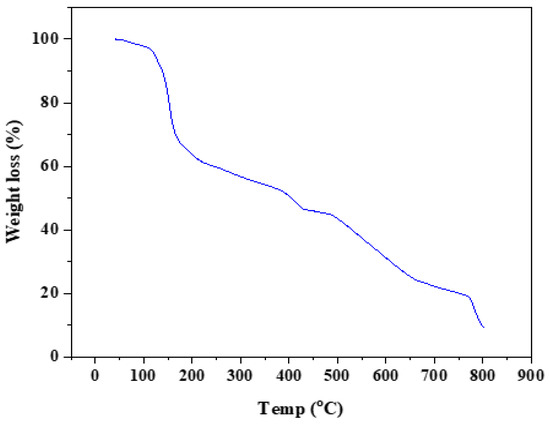 The thermal behaviors of the metal complexes were determined under a nitrogen atmosphere, as shown in Figure 2. Upon comparison, it is clear that the weight loss of the metal(II) complexes correlates with different compositions at specific temperatures. The [Cu(L)(bpy)] 1g complex displays a weight decrement in three steps from 38 to 800 °C. The first one is related to the decrement in the outer lattice dehydration of a single H2O molecule at 30–120 °C. The second step temperature range of 120–270 °C is due to the loss of organic molecules of C10H8N2 (2,2′-bipyridyl). A peak corresponding to a weight loss of 24.52% (calcd. 24.46%) at 420–510 °C was related to the ligand moiety in the metal complexes in the third step and the subsequent complex, thus leaving CuO as a residue. The same trend was traced in the TGA plots of the other metal complexes.