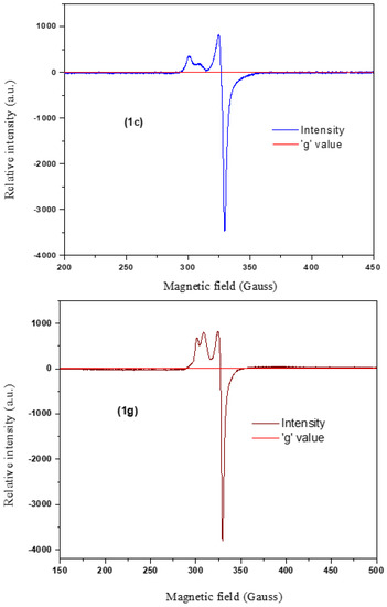 The G values calculated for complexes 1c and 1g were 2.61 and 3.064, respectively. As these G values were found to be around 3.0, the presence of a dx2–y2 ground state of a square pyramidal geometry and a substantial exchange interaction in the polycrystalline state were confirmed [36,37].
