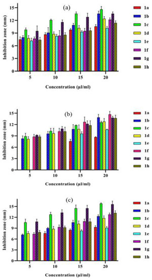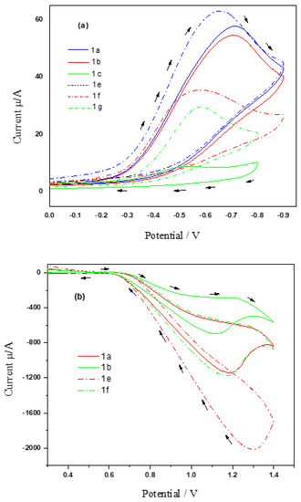 The cyclic voltammograms of the Co(II), Ni(II), and Cu(II) metals were studied at the cathodic region from 0 to –1.4 V (Figure 5a). The voltammogram peaks of cobalt(II) complex 1a, nickel(II) complex 1b, and copper(II) complex 1c showed irreversible one-electron transfer reduction at −0.71 V, −0.71 V, and −0.54 V. Likewise, the absence of counter-reduction patterns in the reverse scan corroborated the irreversible character of the metal in complexes 1(e–g) [45,46]. These reduction potential peaks were observed at −0.66 V, −0.58 V, and −0.58 V, respectively. It was suggested that the following one-electron reduction method should be used: