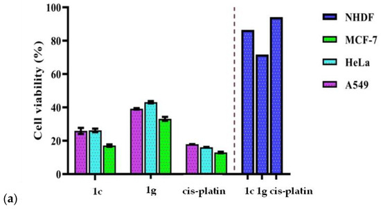 According to the previous literature [17,18], the cytotoxic activity of compounds [Cu(L)(phen)] 1c and [Cu(L)(bpy)] 1g was assessed with respect to three tumor cell lines, including the A549, HeLa, and MCF-7 lines, as well as NHDF normal cells. The medium was switched to DMEM with 1% FBS after one day of growth in Dulbecco’s Modified Eagle Medium with 10% FBS. After one day, 2, 5, 10, 25, 50, and 100 µL doses of the produced compounds diluted in DMSO were applied to the cells, which were then incubated. Each well was then filled with 10 µL of MTT (5 mg/mL) and maintained in this state for 3 h. Farmazone crystals were produced and dispersed in 100 µL of DMSO; then, the absorbance at 570 nm was calculated using an ELISA spectrometer. The proportion of viable cells was determined using the following formula [17,19,20]:
