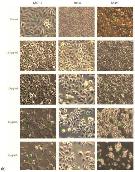 - Mahmood, R.I.; Kadhim, A.A.; Ibraheem, S.; Albukhaty, S.; Mohammed-Salih, H.S.; Abbas, R.H.; Jabir, M.S.; Mohammed, M.K.; Nayef, U.M.; AlMalki, F.A. Biosynthesis of copper oxide nanoparticles mediated Annona muricata as cytotoxic and apoptosis inducer factor in breast cancer cell lines. Sci. Rep. 2022, 12, 16165. [Google Scholar] [CrossRef]
