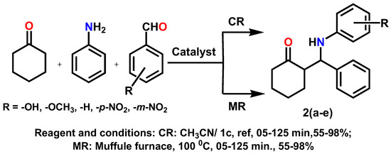 Simple/substituted aryl aldehyde (9.423 × 10−3 mmol; 1.0 equiv.) is mixed with aniline (9.894 × 10−3 mmol; 1.05 equiv.) and cyclohexanone (1.038 × 10−2 mmol; 1.05 equiv.), and optimized catalyst concentration of substitued2,2-bipyridyl/phenanthroline metal (II) salts 1(a–h) (5.44 × 10−2 mmol) is added in the presence of 40 mL of dry CH3CN for 5–125 min under refluxing conditions to yield substituted β-Amino carbonyl derivatives 2(a–e) at 55–98% after purification. All the synthesized β-Amino carbonyl derivatives are thoroughly analyzed via spectral and analytical tools and verified through an examination of the literature.
