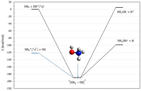 In conclusion, the only reactive process that can form a hydroxylamine cation seems to be reaction 6, which, although requiring an excited state of , is barrierless and probably efficient. We cannot exclude that due to the energetic proximity of the respective electronic states, the collision of and in a singlet state can interconvert into and , thus leading to the hydroxylamine cation via the same PES of reaction 6. Thus, we can propose a second possible mechanism toward a hydroxylamine cation that would start from two ground state molecules and proceed along two singlet PESs, as: