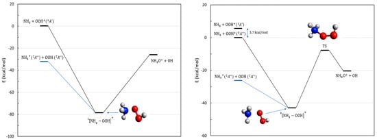 Reactions 14–16 involve hydrogen peroxide and its cation. H2O2 is the smallest chiral molecule, owing to the asymmetry of its anti conformation that is the most stable one [24]. Its cation is a radical in a doublet state. Since ionizing H2O2 is easier than NH2, the ground state of the system corresponds to the entrance channel of reaction 14. The energetics of the reactive channels are illustrated in Figure 6. This reaction can proceed on a singlet (left panel in Figure 6) or triplet (right panel of Figure 6) PES, and in both cases, is exoergic. While for the singlet PES we have been able to locate the reaction complex, its equivalent for the triplet PES has eluded our search.